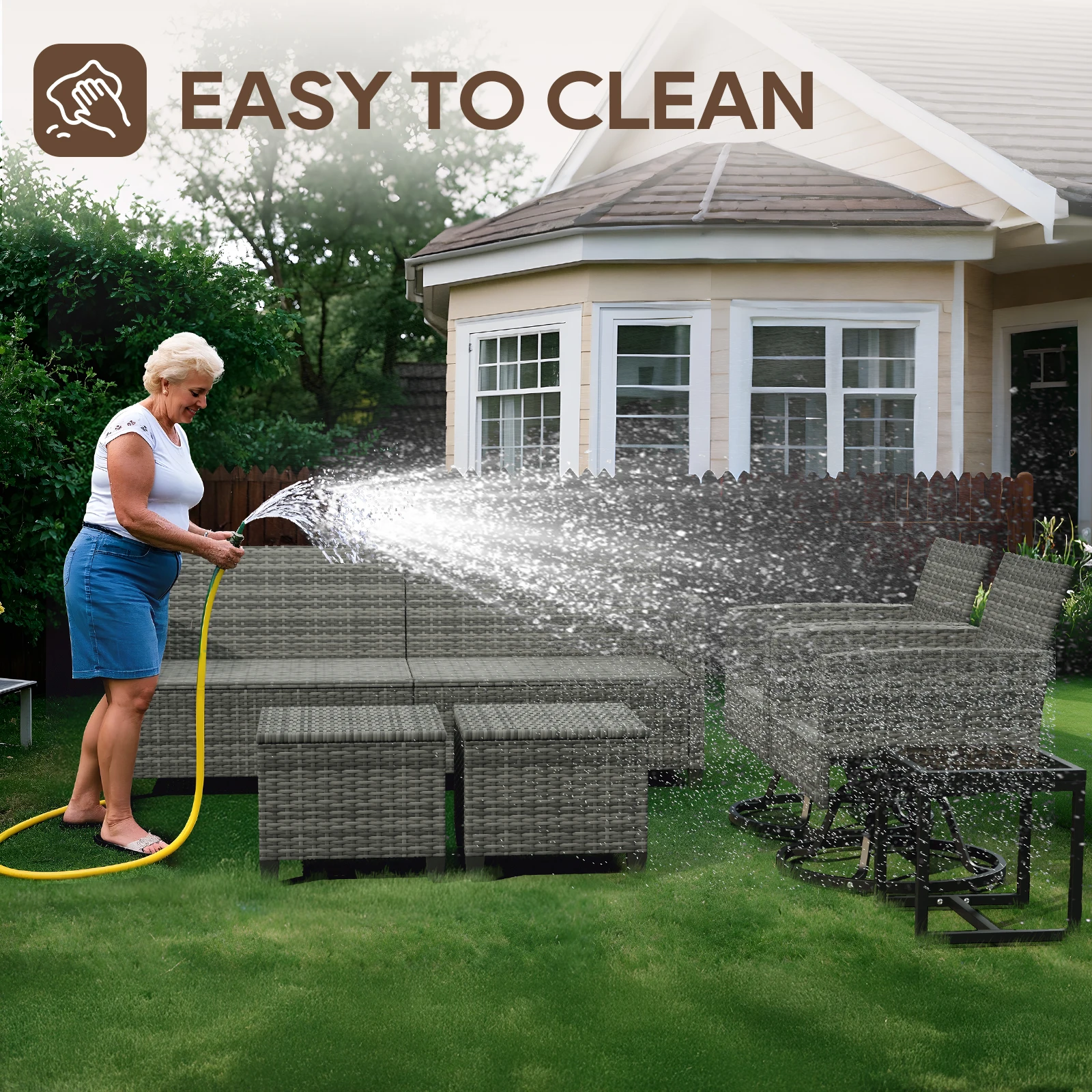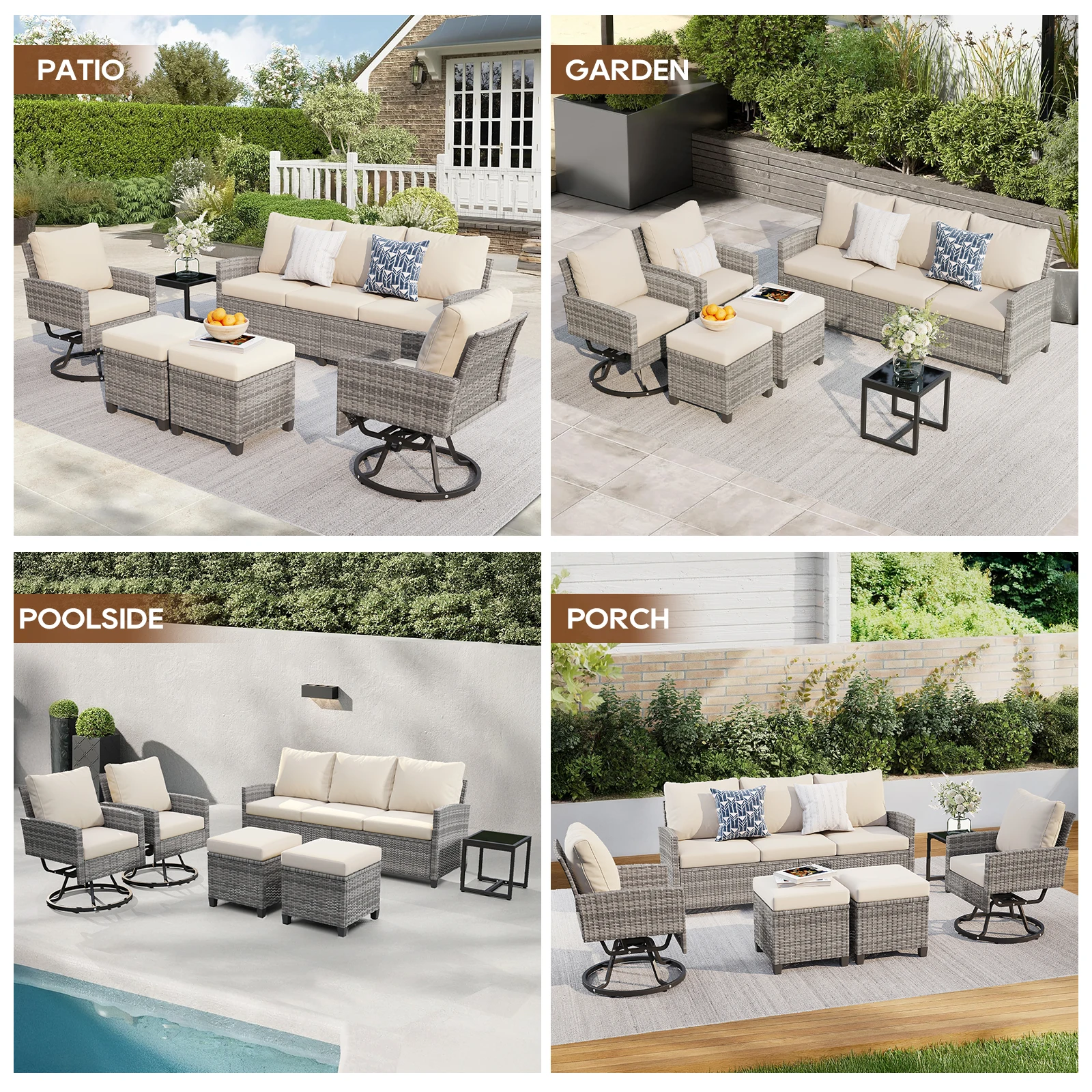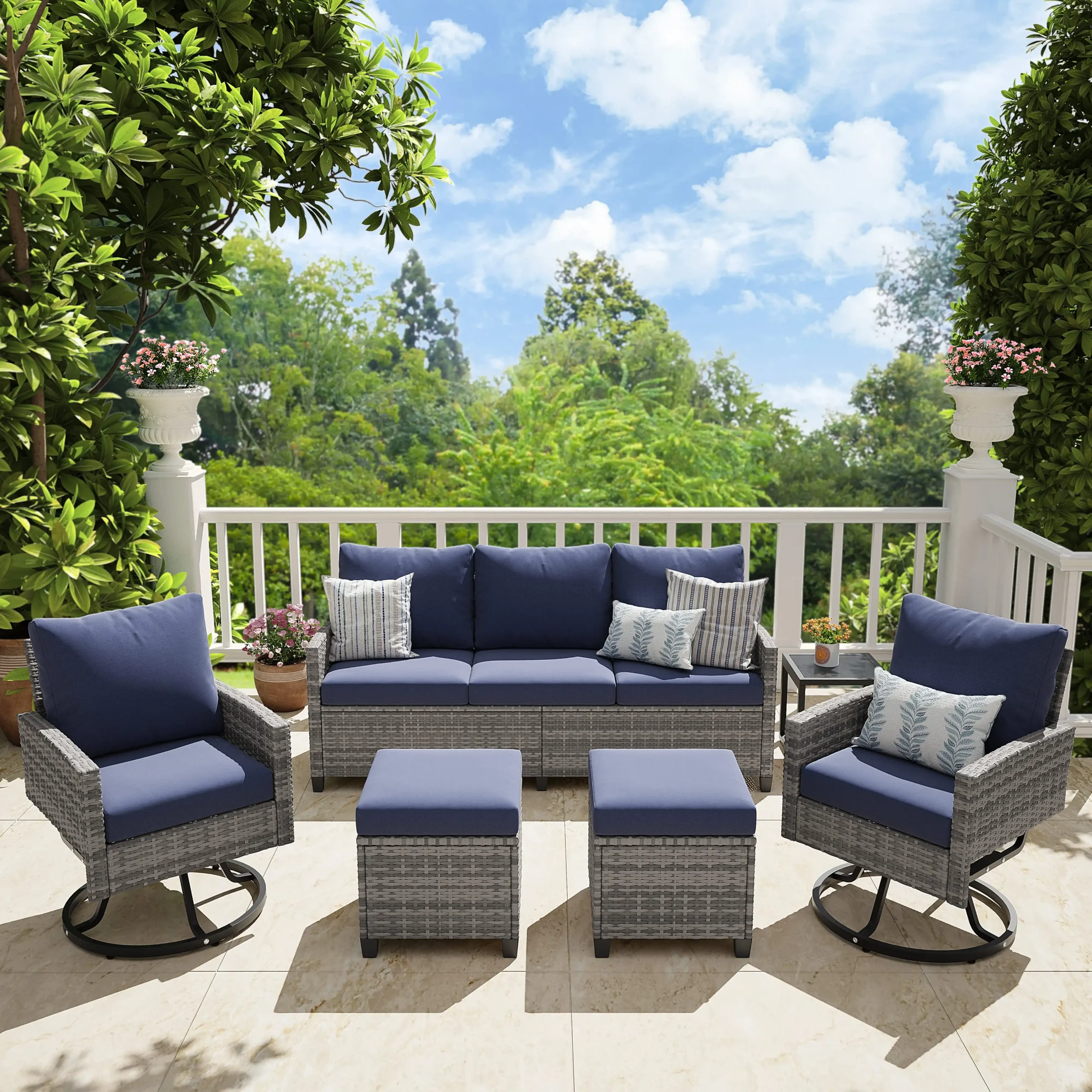 Upgrade your outdoor living area with this 6-piece wicker patio furniture set. Featuring swivel chairs, a 3-seat sofa, an ottoman, and a tempered glass side table, it offers comfort and versatility for relaxing or entertaining. Made from all-weather PE rattan, the set is durable, weather-resistant, and built to last. Perfect for patios, gardens, balconies, or decks, this elegant set combines style, functionality, and long-lasting outdoor comfort.