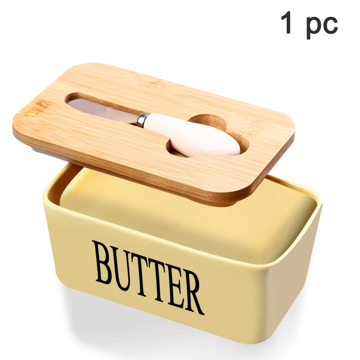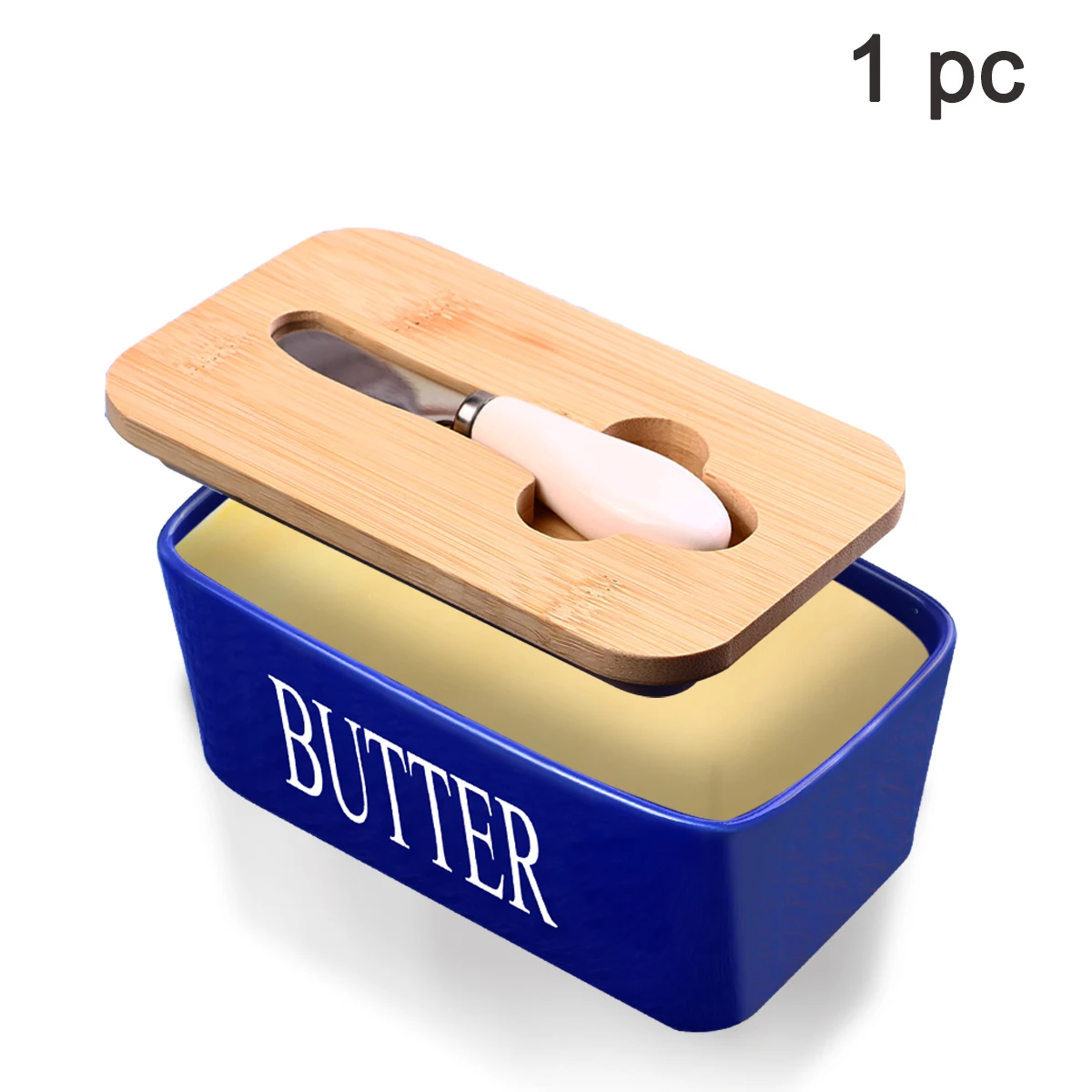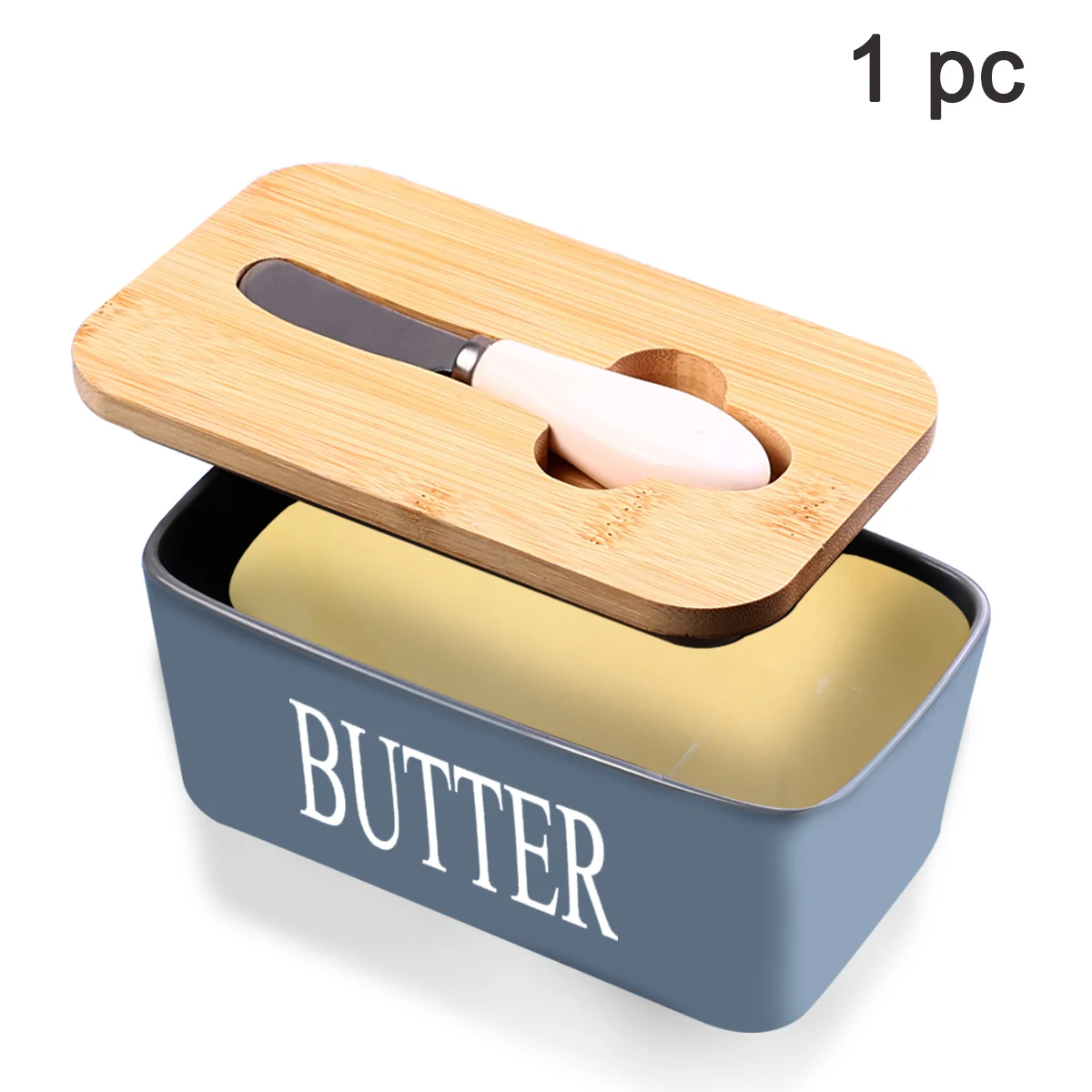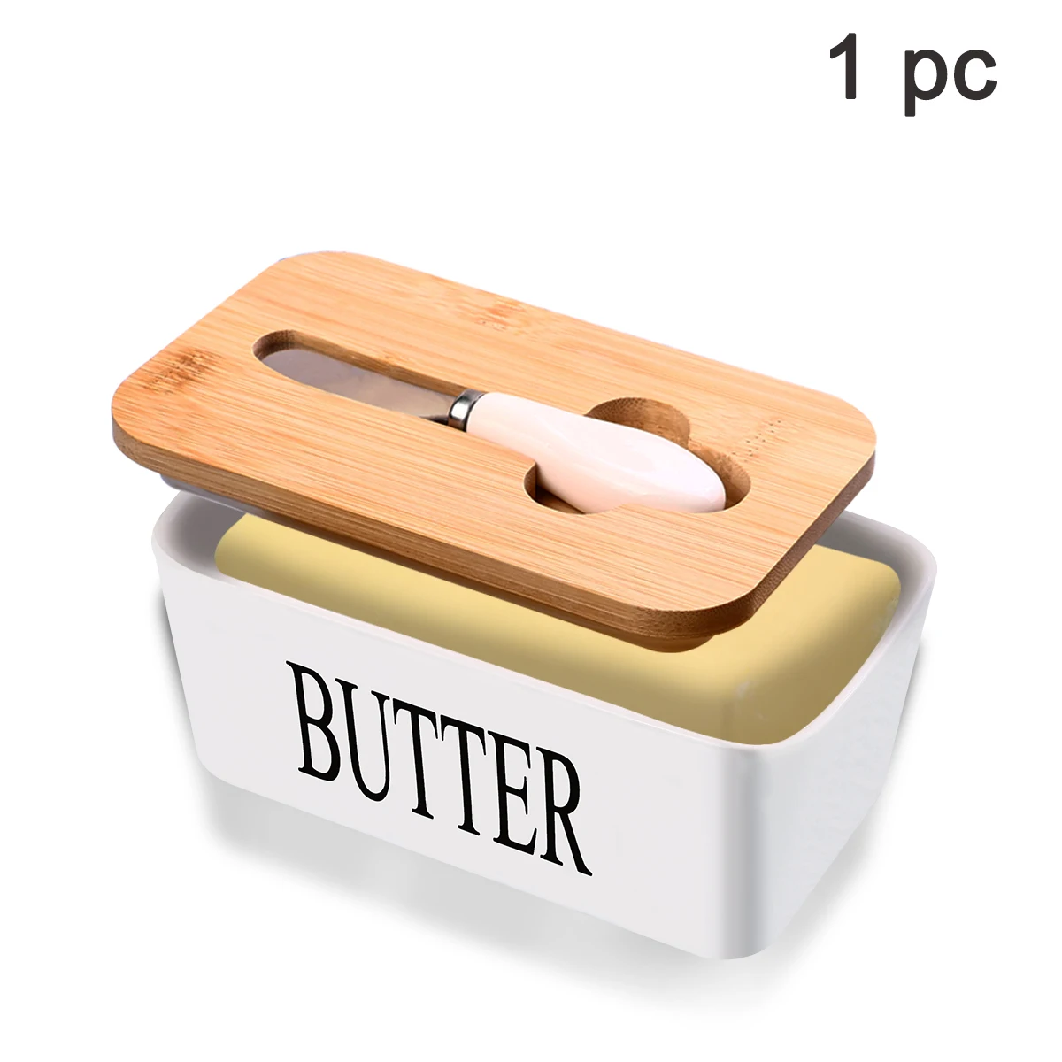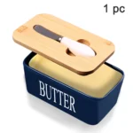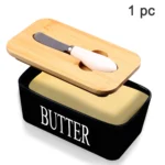 Store and serve butter in style with this elegant ceramic butter dish set. Designed with a natural bamboo lid, it features a built-in butter knife and a double silicone sealing ring to help keep butter fresh and protected. The smooth ceramic base is easy to clean and adds a modern, refined touch to your kitchen or dining table. Practical and beautifully crafted, this butter keeper combines convenience, freshness, and timeless kitchen design.